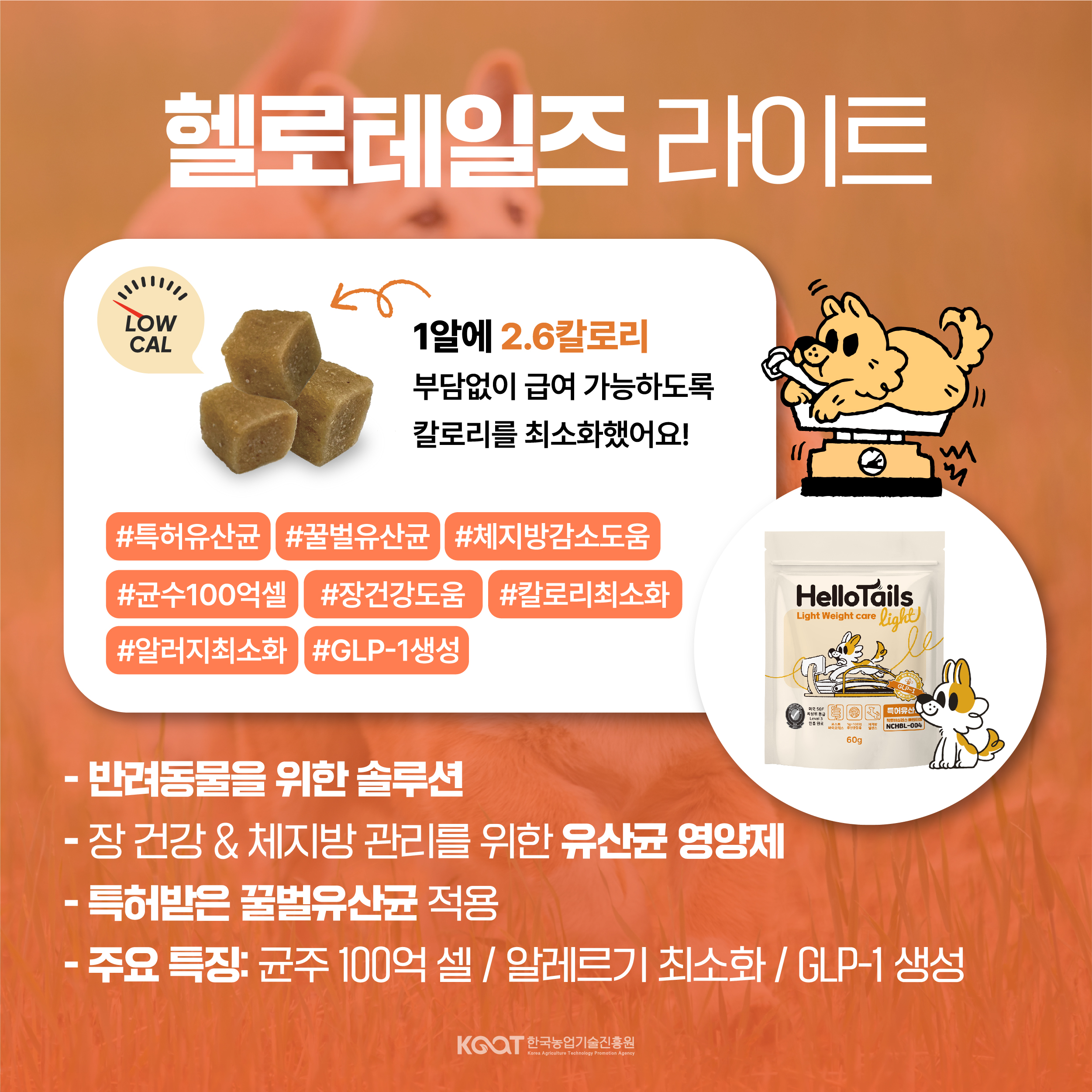 최근 과도한 식이 및 제한된 운동으로 인해 비만 동물이 증가하고 있어, 이러한 동물에 도움이 될 반려동물용 유산균 영양제 ‘헬로테일즈 라이트’를 출시하여 판매하고 있습니다.