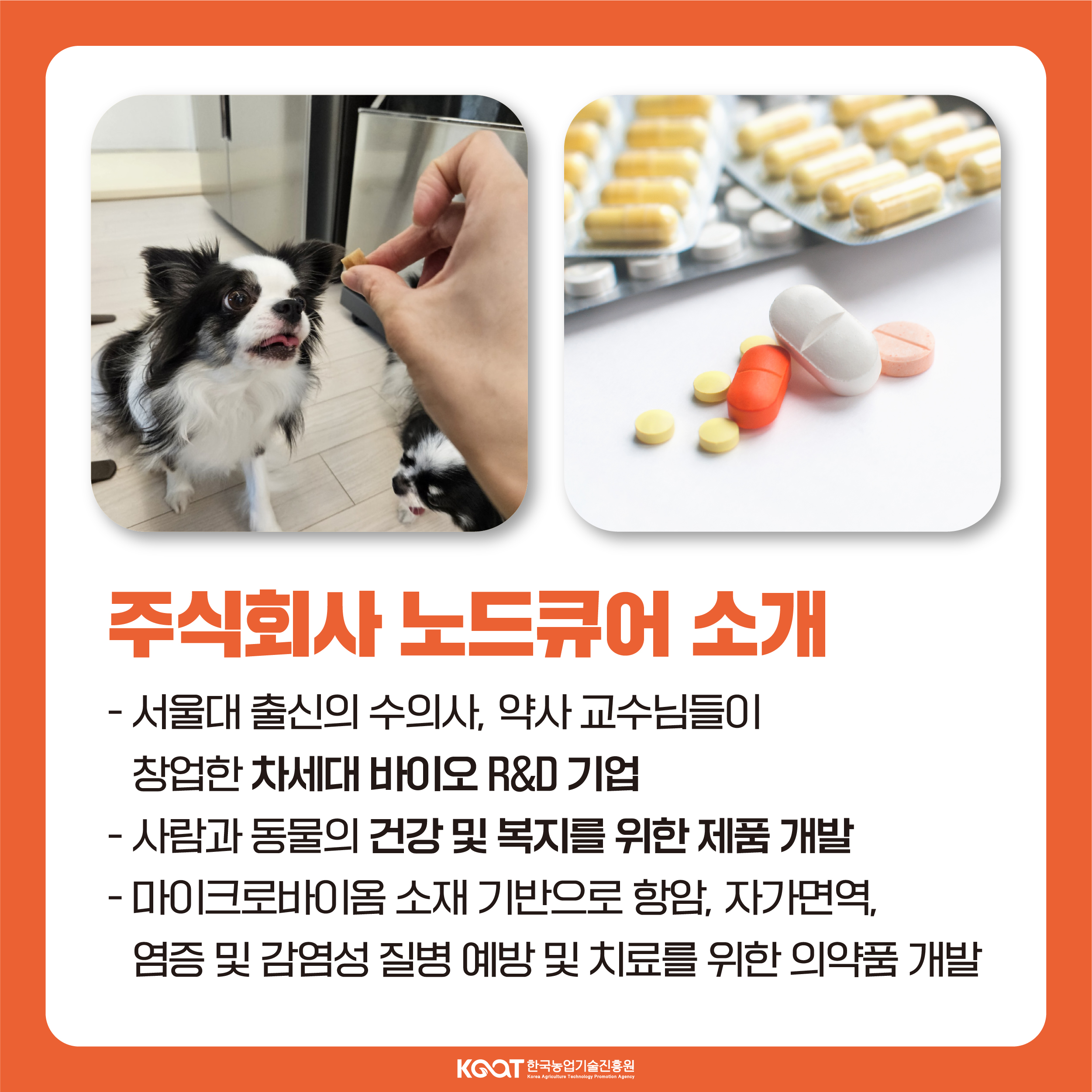 (주)노드큐어는 서울대 출신의 수의사, 약사 교수님들이 창업한 차세대 바이오 R&D 기업입니다. 마이크로바이옴 소재 기반으로 항암, 자가면역, 염증 및 감염성 질병 예방 및 치료를 위한 의약품 개발을 목표로 하고 있으며, 동시에 건강기능식품 개발을 통한 total healthcare를 추구하는 기업입니다.