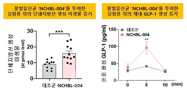 ㈜노드큐어(대표 박종환)는 정상 쥐에게 꿀벌유산균 NCHBL-004 균주를 먹였을 때, 장내 단쇄지방산 생성 미생물의 증가와 GLP-1의 체내 상승효과를 확인했다.
